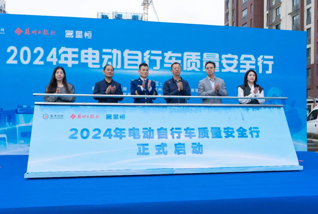 電動自行車全鏈條整治是一項系統工程,需要社會各方力量的積極參與和共同守護。活動現場,蘇州市消防救援局、蘇州日報社、蘇州高新區市監局、蘇州高新區東渚街道、蘇州市自行車電動車行業協會、星恒電源等相關負責人上台,共同啓動“2024年電動自行車質量安全行”公益活動。
